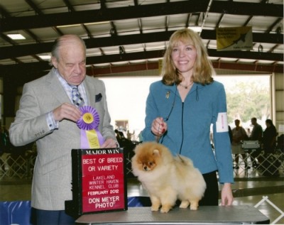 Malcolm (now known as Vegas) was owned and shown in the USA by Jessica Satallante of Jessica's Poms. He finished his championship quickly as a puppy with multiple BOB wins from the classes. He has since gone to live in Russia with Natalia Artemova and Larissa Prokhorova.
